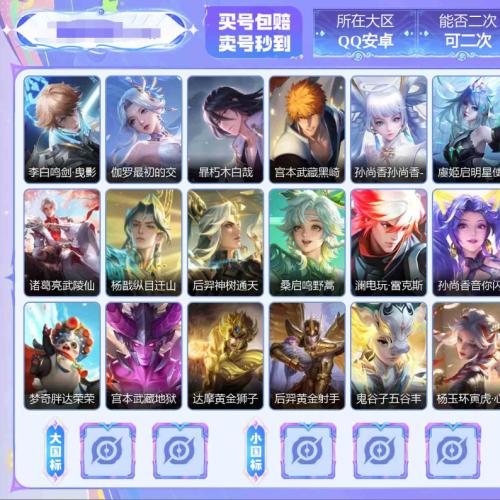 【店长推荐·鸣剑曳影·最初的交响·黑崎一护·暃朽木白哉·杨戬纵目迁山·澜电玩雷克斯·孙尚香异界灵契·武陵仙君·可二次】YXw18868-安卓Q-127英雄-378皮肤-22王者印记-300铭文-贵族积分6w【贵族8】【2典藏·2珍品·12传说·1天幕·20按键】【因赛季更新游戏段付以上号为准!】 【英雄全皮】:刘禅全皮,孙权全皮,狂铁全皮,盾山全皮,猪八戒全皮 【荣耀典藏】:李白鸣剑曳影,伽罗