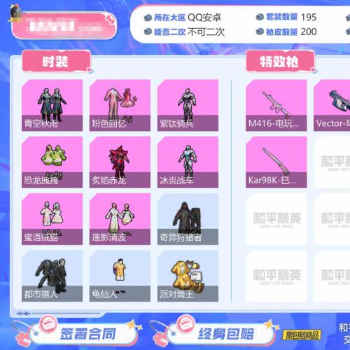 【王牌印记数量:9 套装数量:195 枪皮数量:200 粉装数量:8 特效枪数量:6 优质套装:蜜语绒猫,紫钛骑兵,冰炎战车,莲影清波,青空秋雨,恐龙拽拽,炙焰赤龙,粉色回忆 热门套装:11个 奇异狩猎者,都市猎人,龟仙人,派对舞王,狂沙舞者,暗影哥特,雪山精英,深海小丑鱼,迅捷狂鲨,破蛋小黄鸡,浪漫天命 热门载具:1个 路特斯ELETRE(冰川蓝) 热门枪械:M416-电玩时刻,Vector-环太平洋,Kar98K-巳巳如意 飞行器:3个 】