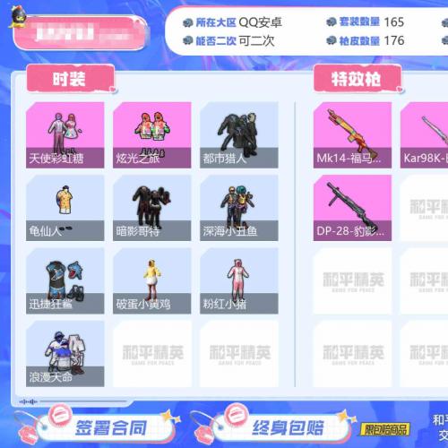 【王牌印记数量:12 套装数量:165 枪皮数量:176 粉装数量:2 特效枪数量:3 优质套装:天使彩虹糖,炫光之旅 热门套装:8个 都市猎人,深海小丑鱼,浪漫天命,龟仙人,暗影哥特,粉红小猪,破蛋小黄鸡,迅捷狂鲨 热门枪械:Kar98K-巳巳如意,Mk14-福马献瑞,DP-28-豹影疾电】