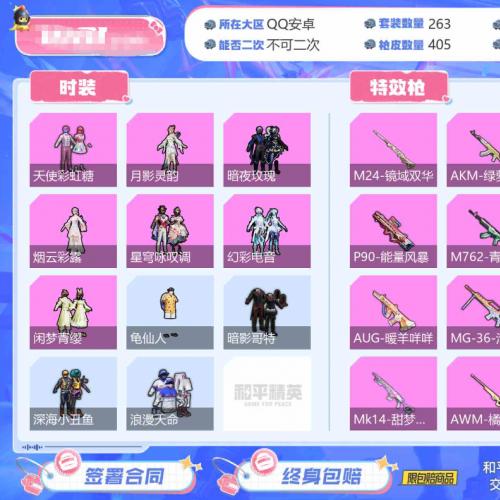 【王牌印记数量:0 套装数量:263 枪皮数量:405 粉装数量:0 特效枪数量:17 优质套装:天使彩虹糖,暗夜玫瑰,闲梦青缨,烟云彩露,月影灵韵,星穹咏叹调,幻彩电音 热门套装:4个 深海小丑鱼,浪漫天命,龟仙人,暗影哥特 热门载具:1个 黑曜夜骑 热门枪械:AWM-橘柚倾心,M24-镜域双华,MG3-酷泡奶龙,P90-能量风暴,SCAR-L-锦绣绵绵,AKM-绿萝繁花,M416-电玩时刻,GROZA-镜光银凌,AUG-暖羊咩咩,M762-青锋波束,UMP45-量子极限,Vector-绯穹魔姬,Kar98K-巳巳如意,Mk14-甜梦熊击,MK12-雪月幻音,DP-28-豹影疾电,MG-36-沧焰双生 飞行器:5个 】