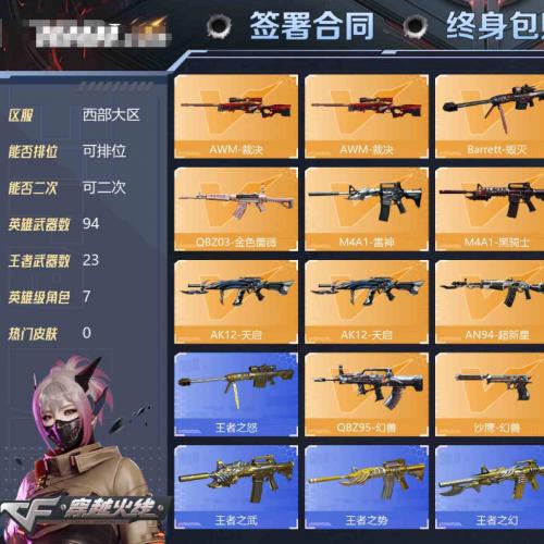 【可二次 英雄武器数量:94 英雄角色数量:7 王者武器数量:23 王者零,王者之瞳,王者沙漠玫瑰,狐影,雅典娜 零,魅影,兰-海滩派对,零-水下丽影,雅典娜 M4A1-黑骑士音效卡,Barrett-毁灭音效卡 AK47-B-常胜将军-曹操 稀有武器:23个 六烈龙】