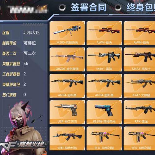 河南一区-58V-2王者-3炫金 【传说角色】:传说影煞 【热门武器】:QBZ03-金色蔷薇,Scar Light-白虎,HK417-朱雀,M200-竞技荣光,死亡之眼,M4A1-黑骑士,汤姆逊-烈龙,RPK-盘龙,雷神-小红,沙鹰-修罗*2 【王者炫金武器】:炫金毁灭*3 【音效卡】:M4A1-黑骑士音效卡 【皮肤】:幻神-AG-CFPL S24冠军 皮肤,白虎-大汉风骨,金色蔷薇-电竞之星