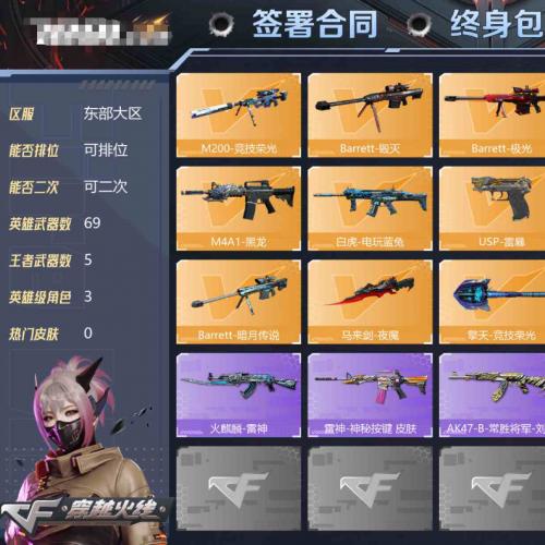 【可二次 英雄武器数量:69 英雄角色数量:3 王者武器数量:5 王者葵-惊若翩鸿 战地猎狐 Barrett-极光音效卡 无影耀金,战神-紫绶金章,战神-流金岁月,AK47-B-常胜将军-曹操,AK47-B-常胜将军-刘备 稀有武器:8个 】