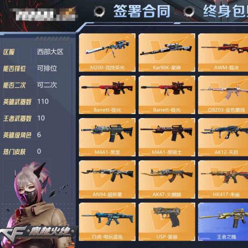 【可二次 英雄武器数量:110 英雄角色数量:6 王者武器数量:10 王者-瞳-闭月羞花,王者春 零 AK47-火麒麟音效卡,M4A1-雷神音效卡,M4A1-黑龙音效卡,M4A1-黑骑士音效卡,Barrett-毁灭音效卡,Barrett-极光音效卡 黑龙-361,无影-霓裳,战神-粉色甜心,战神-紫绶金章,战神-流金岁月,天龙-传奇白鲨,修罗-CFSTAR,修罗-星空,屠龙-荣耀之锋,无影-神兵利器 稀有武器:23个 六烈龙,六盘龙】
