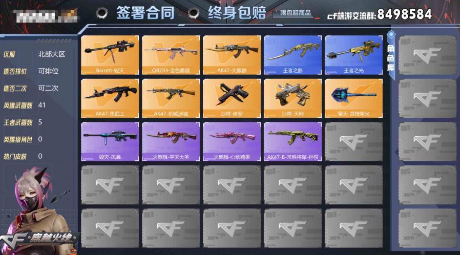 自带包赔最高三倍】:北部战区:河北一区-LV100-等级元帅-段位未定级-41V-5王者-2炫金【热门武器】:QBZ03-金色蔷薇,死亡之眼,羊驼玩偶,沙鹰