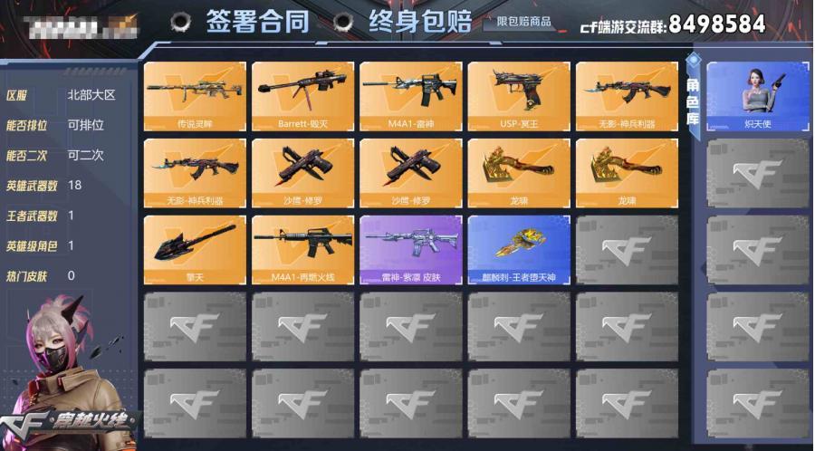 【可二次 英雄武器数量:18 英雄角色数量:1 王者武器数量:1 炽天使 无影-神兵利器 传说灵眸 稀有武器:3个 】