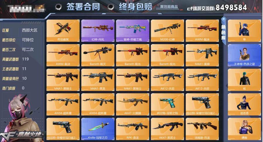【不可二次 英雄武器数量:46 英雄角色数量:0 王者武器数量:8 M4A1-雷神音效卡 龙啸-黯钢战甲 稀有武器:9个 六烈龙】